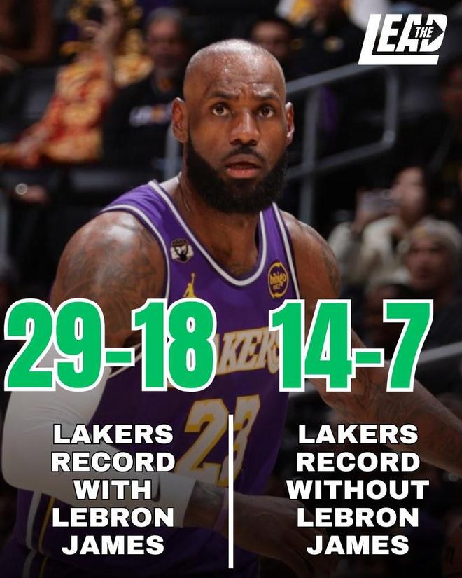 賽後根據統計,本賽季在詹姆斯出場的比賽中,湖人取得29勝18負的成績,勝率達到了62%,而在詹姆斯缺陣的比賽中,湖人的戰績為14勝7負,勝率僅為50%。