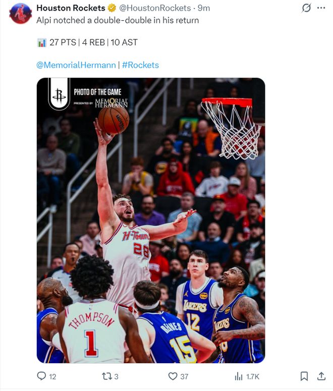 火箭官方寫道:申京在複出後拿到了兩雙數據。
