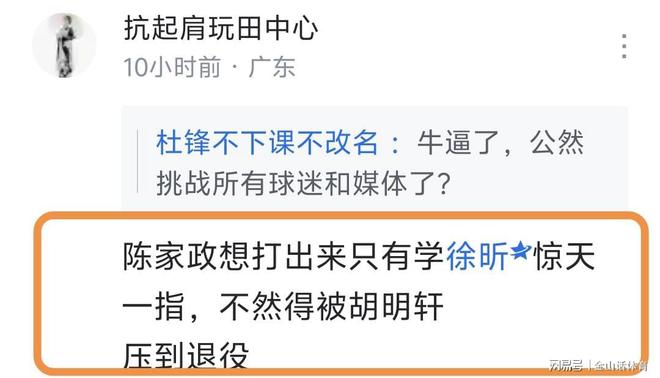 “把誰換下來呢?把誰的時間調少一點合適呢?”,杜鋒的這番話,賽後引起了眾多廣東球迷的不滿,紛紛在網絡平台留言。“把你的時間調少一點,趕緊執包袱過主啦”;“張浩嘉:簽對了公司底氣就是足。”;“陳家政想打出來隻有學徐昕驚天一指,不然得被胡明軒壓到退役 ”。