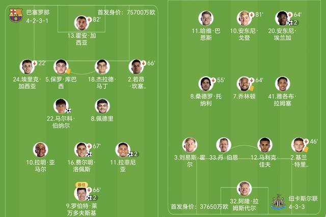 第28分鍾,亞馬爾傳球被斷,巴恩斯送出橫傳,埃蘭加跟進得分,紐卡2-2又扳平!